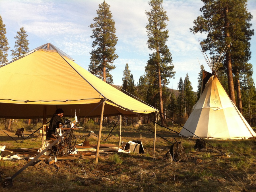 Here is a brief listing of what we have to offer. The primary intention and inspiration of Rogue Dwellings is to shelter the people through empowerment. We can help facilitate an understanding of what it is to live on the ground around the fire, less through the internet and more with the elements. Get in touch with the ground, get in touch with us, we have ongoing workshops for tipi living and making. We also make tipis and other tents, like this seven sided tensile tent, which houses our treadle sewing machine.